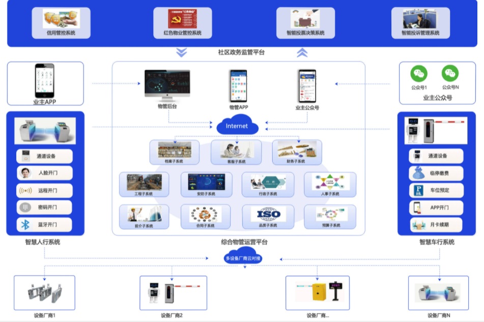 智慧社区整体解决方案集物联网、云计算、大数据、智能算法等多种技术,将社区安防管理、物业管理、社区O2O、邻里社交、智能家居等服务模块融合统一。